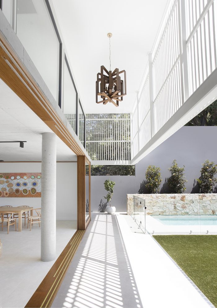 A screened facade wraps the upper levels, overhanging a more open ground floor plane to provide the cantilevered edge; which gives privacy, weather and heat protection and a sense of lightness to the floating facade.