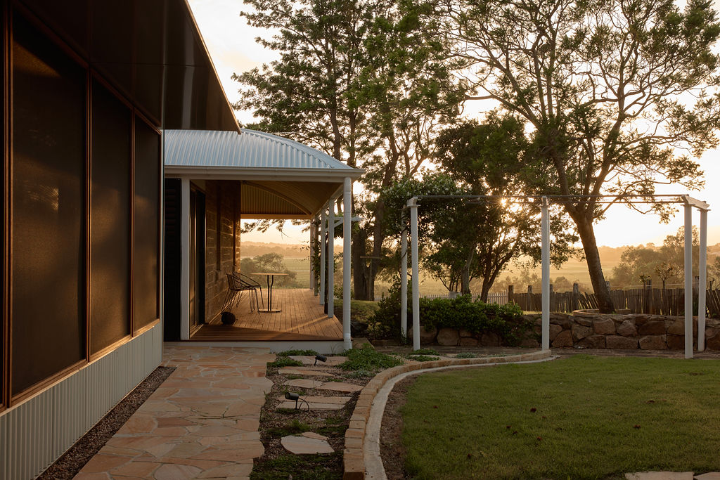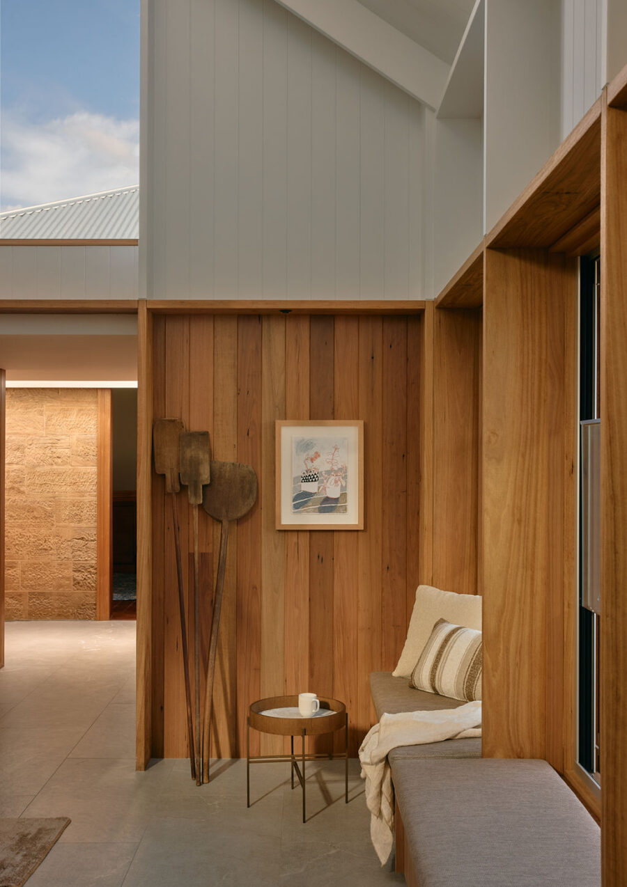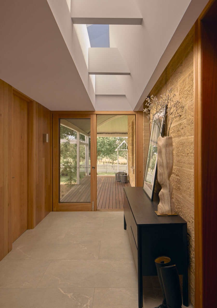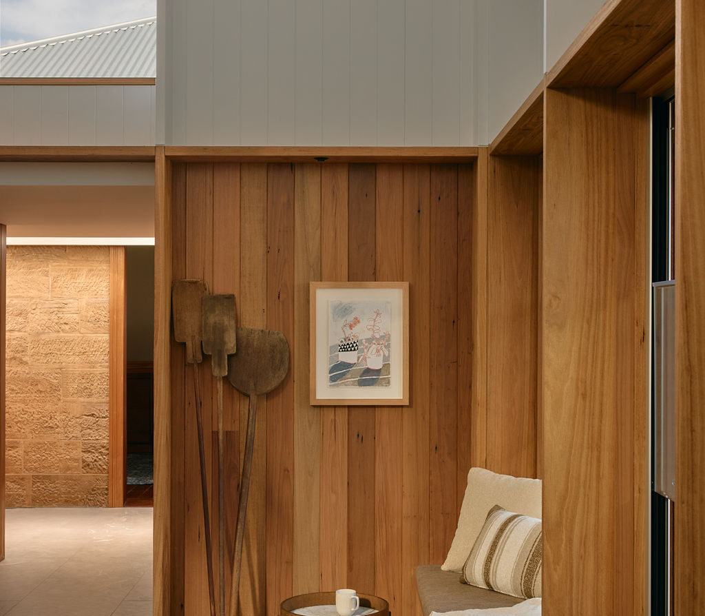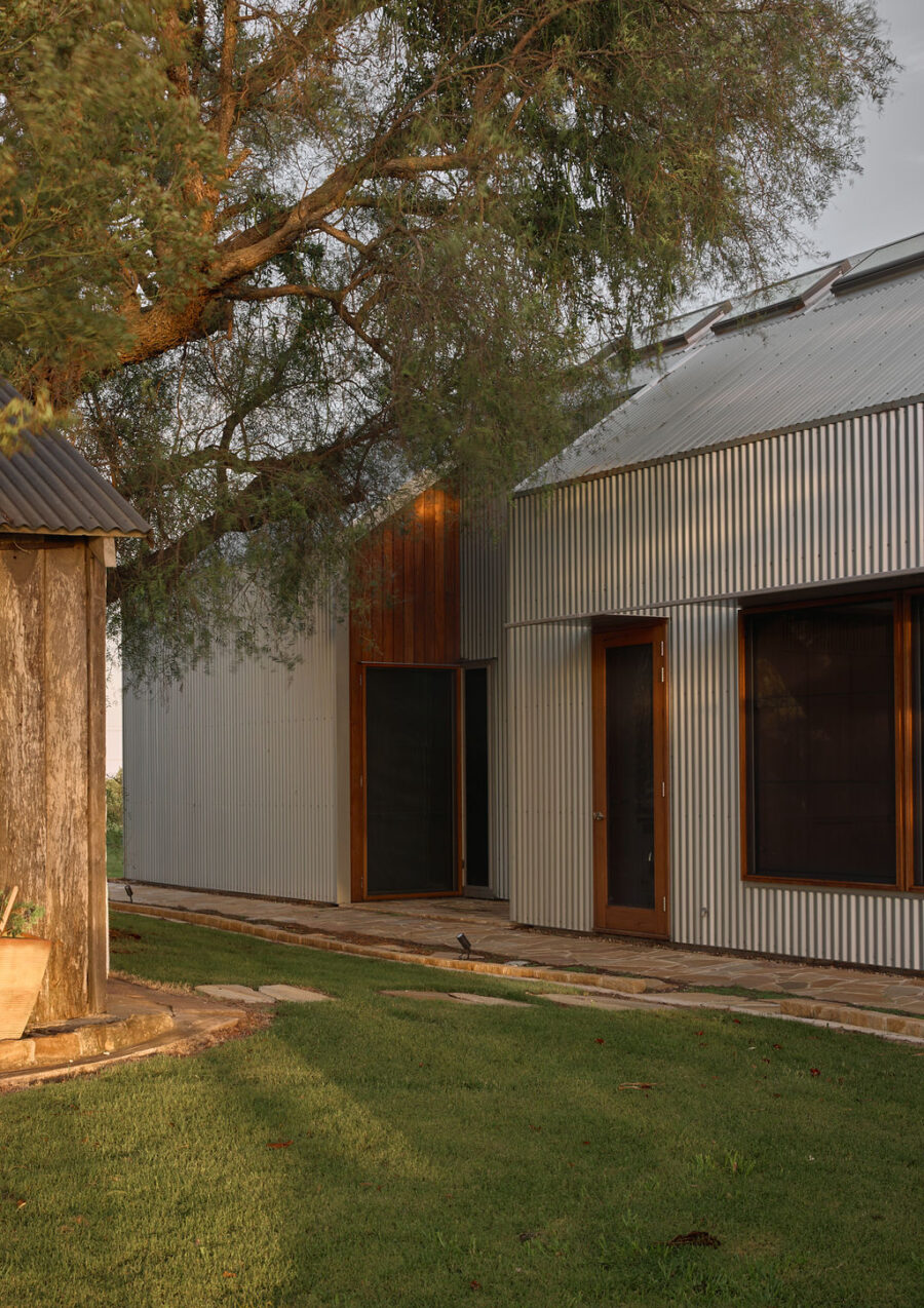 While the form seeks to create separation, the material palette aims to create connection. The corrugated iron sheets, while reminiscent of agricultural materiality, establish a shared language between the dwellings, while the new timber cladding pays tribute to the textural context. Internally, the new timber cladding is expressed as a datum in recognition of the original sandstone walls both in height and in tone, while creating a sense of intimacy within the expansive interior.