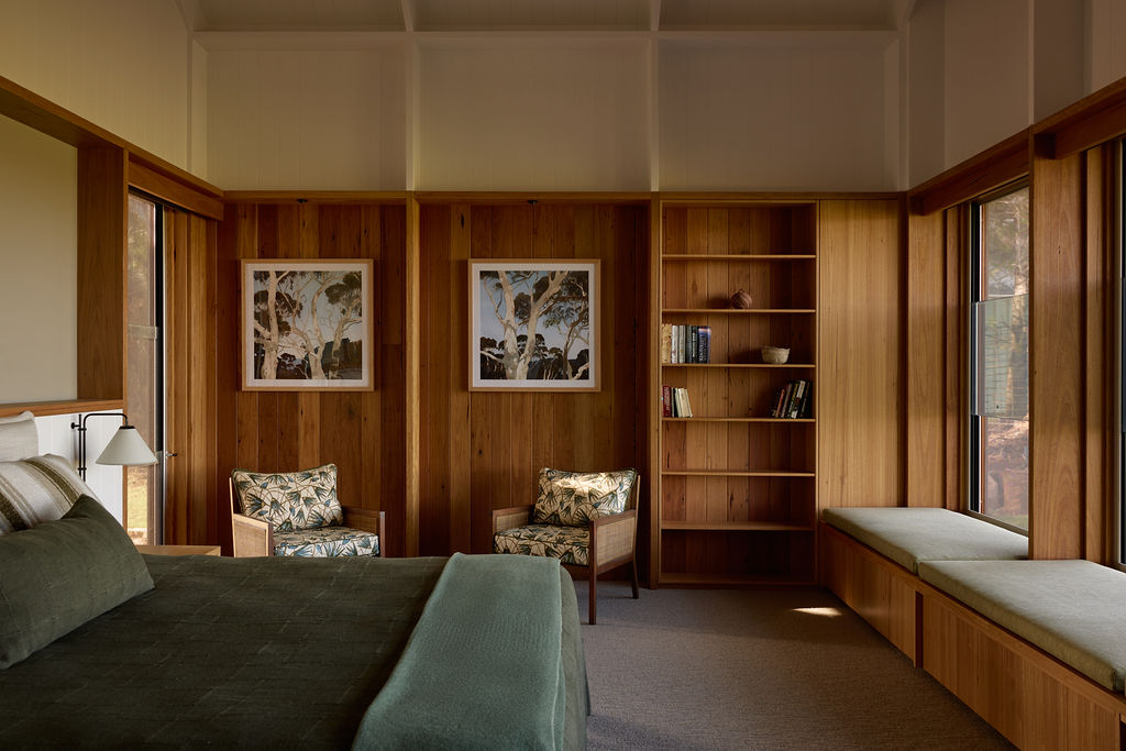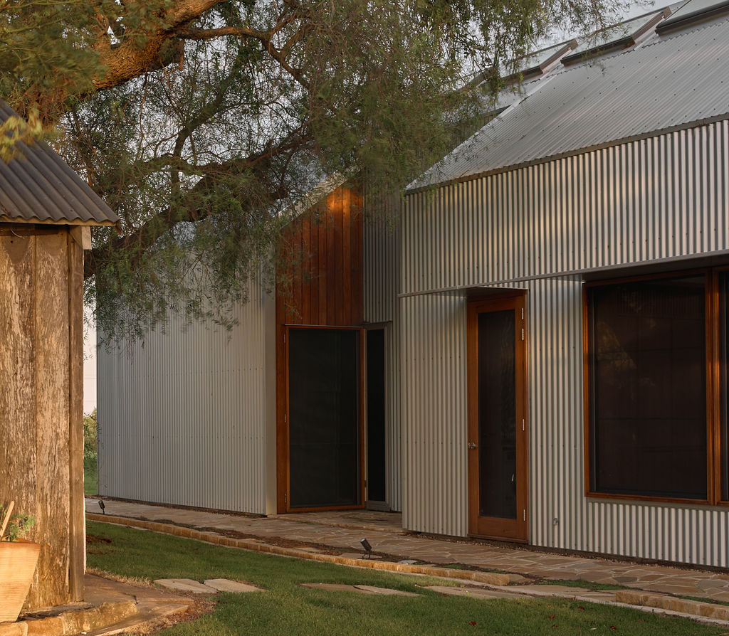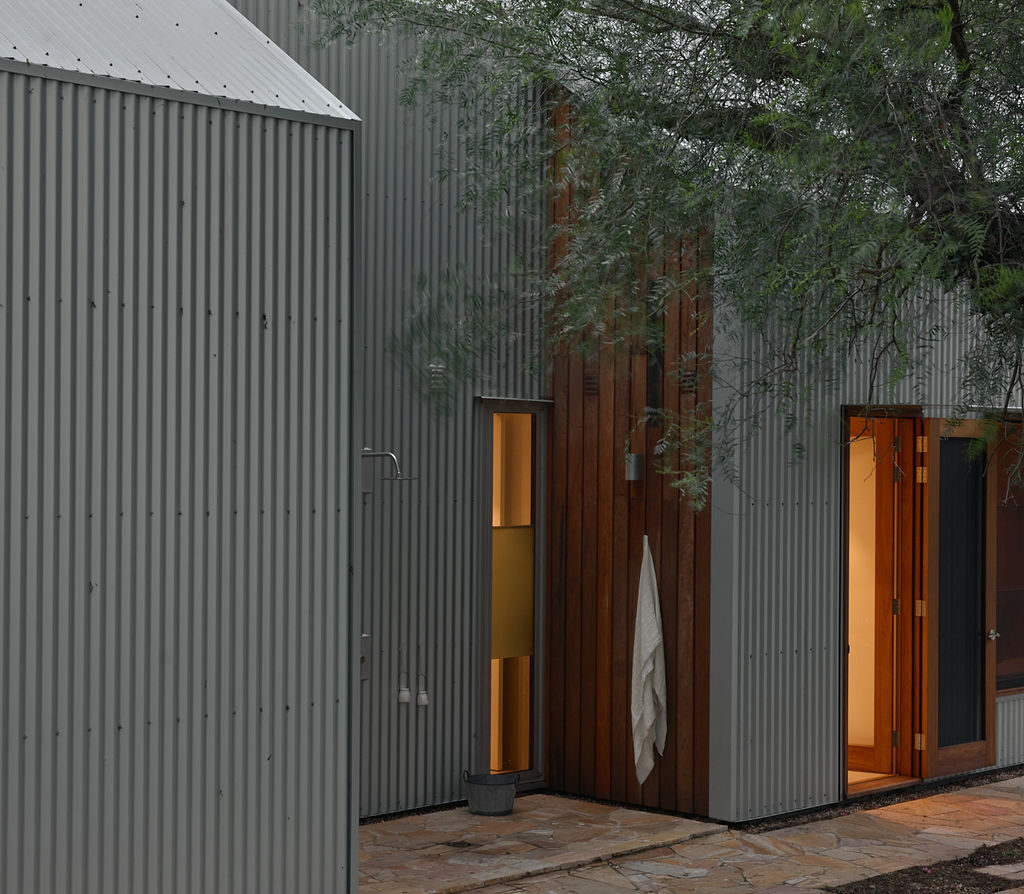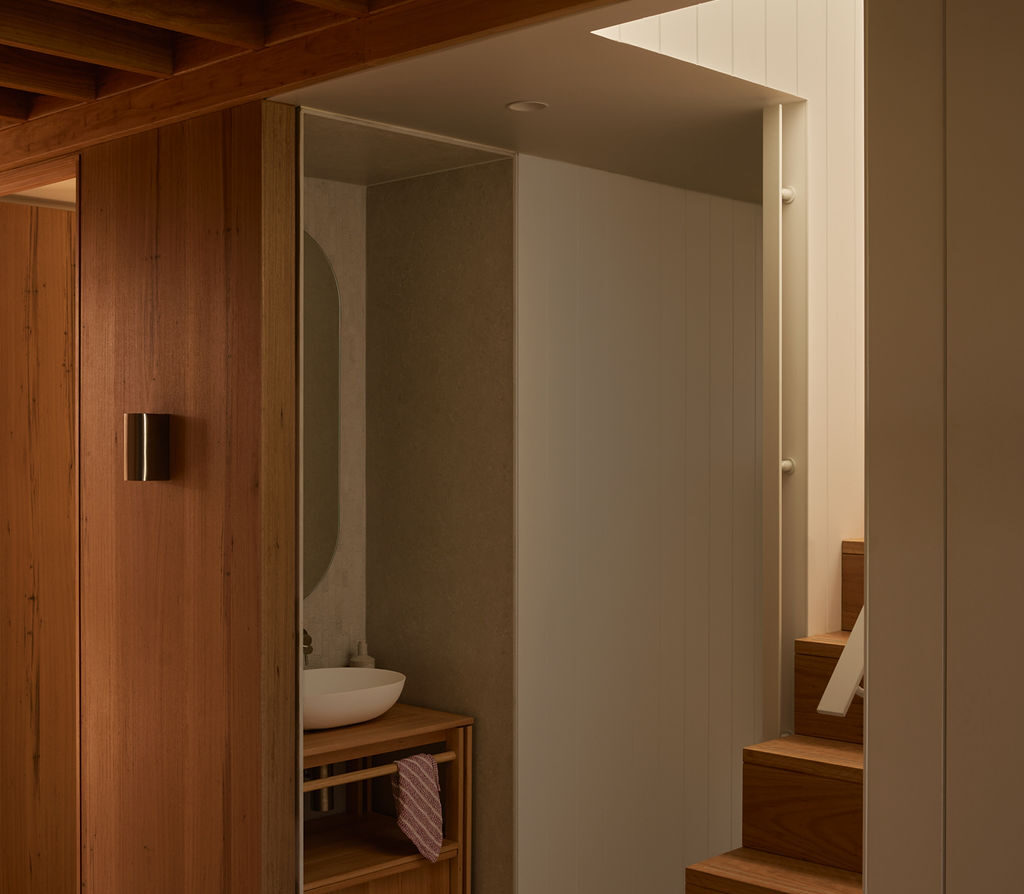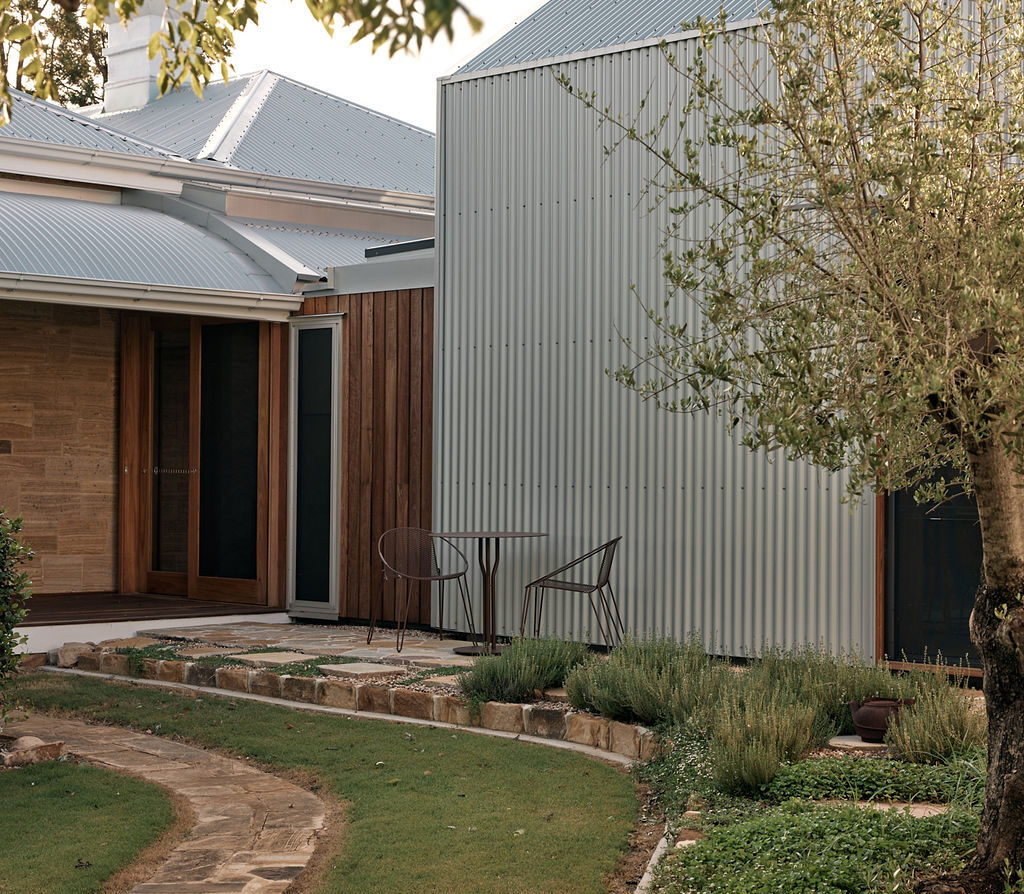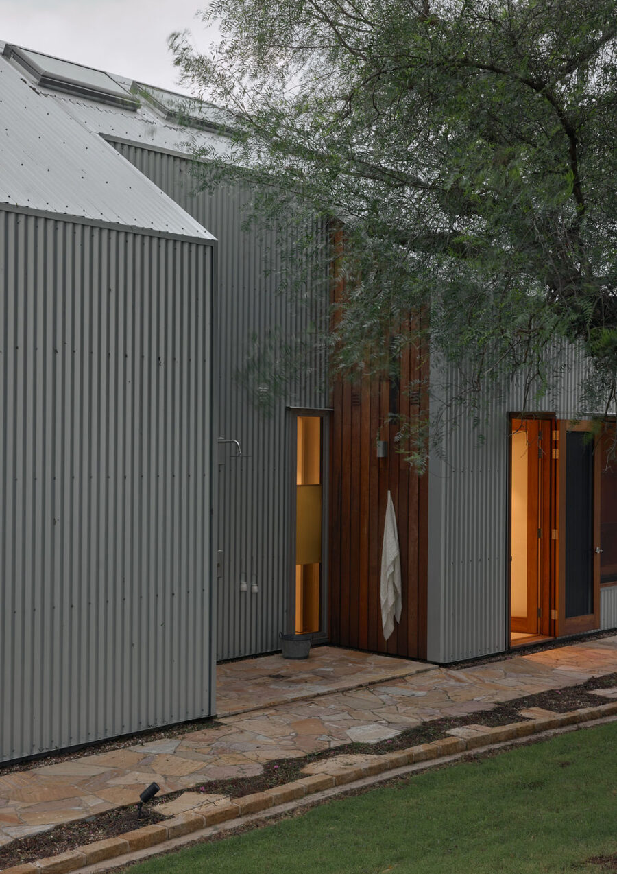 While the form seeks to create separation, the material palette aims to create connection. The corrugated iron sheets, while reminiscent of agricultural materiality, establish a shared language between the dwellings, while the new timber cladding pays tribute to the textural context. Internally, the new timber cladding is expressed as a datum in recognition of the original sandstone walls both in height and in tone, while creating a sense of intimacy within the expansive interior.