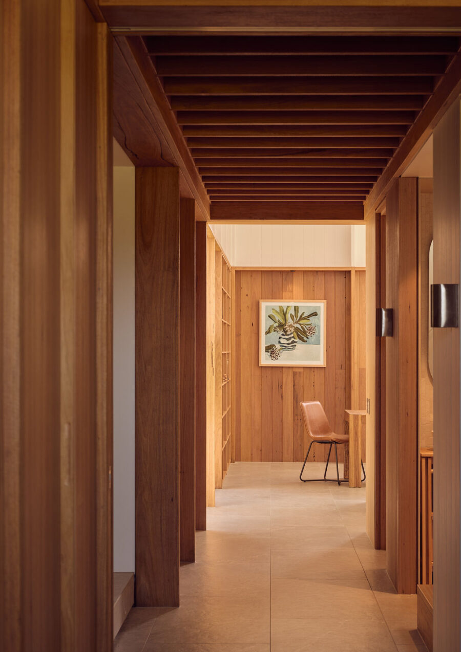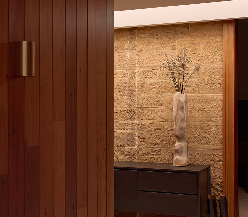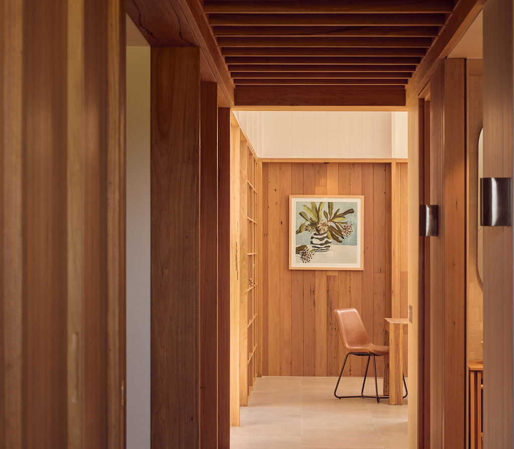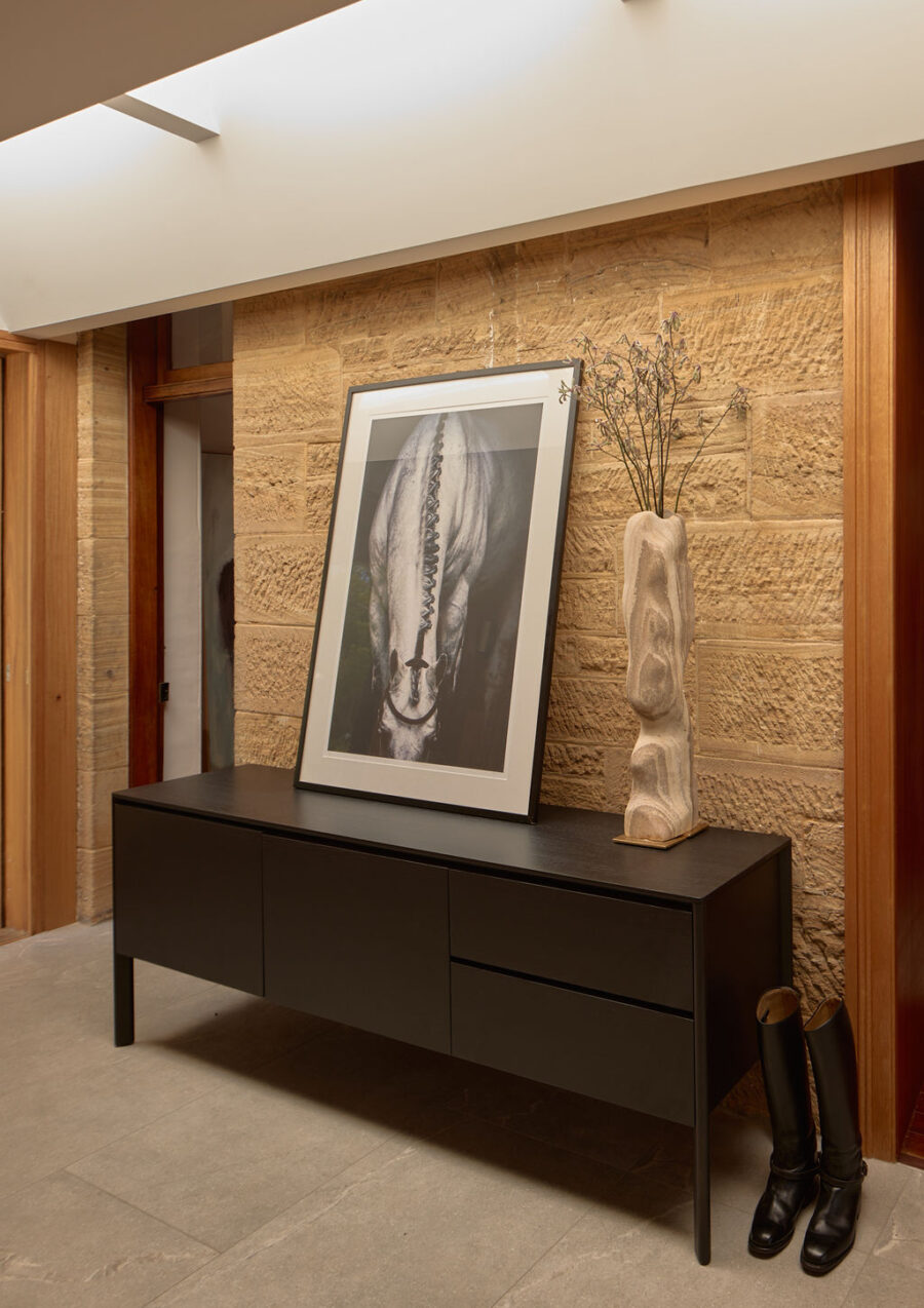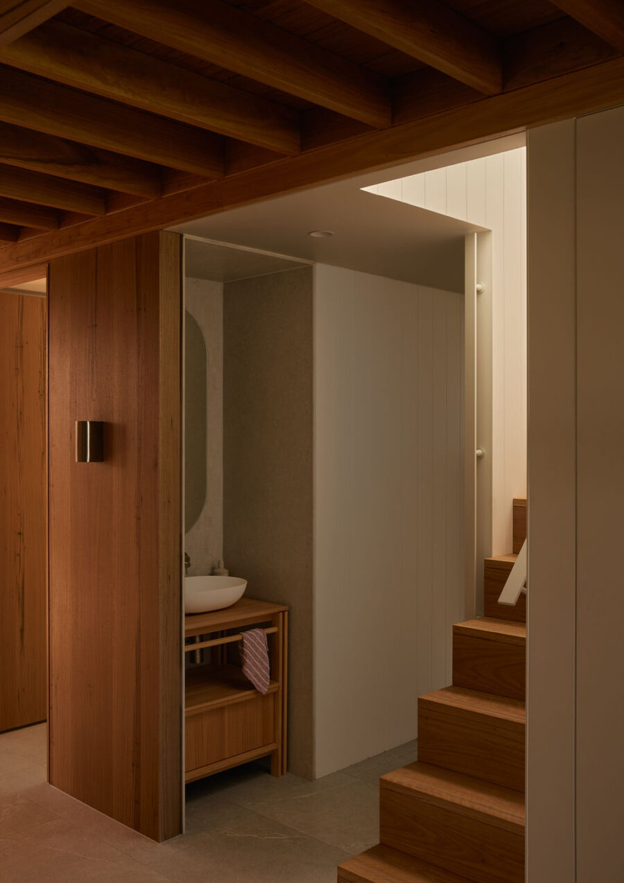 While the form seeks to create separation, the material palette aims to create connection. The corrugated iron sheets, while reminiscent of agricultural materiality, establish a shared language between the dwellings, while the new timber cladding pays tribute to the textural context. Internally, the new timber cladding is expressed as a datum in recognition of the original sandstone walls both in height and in tone, while creating a sense of intimacy within the expansive interior.