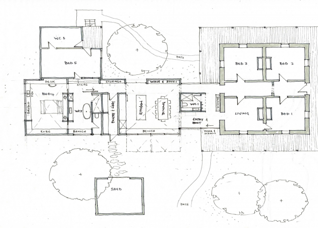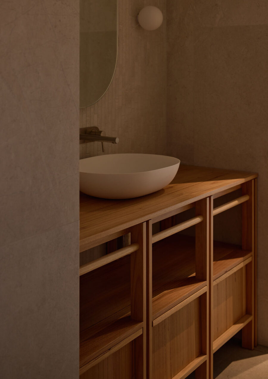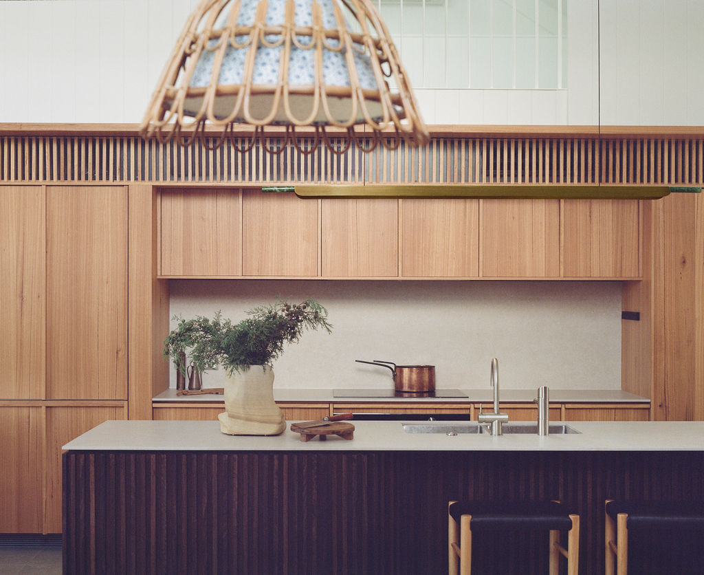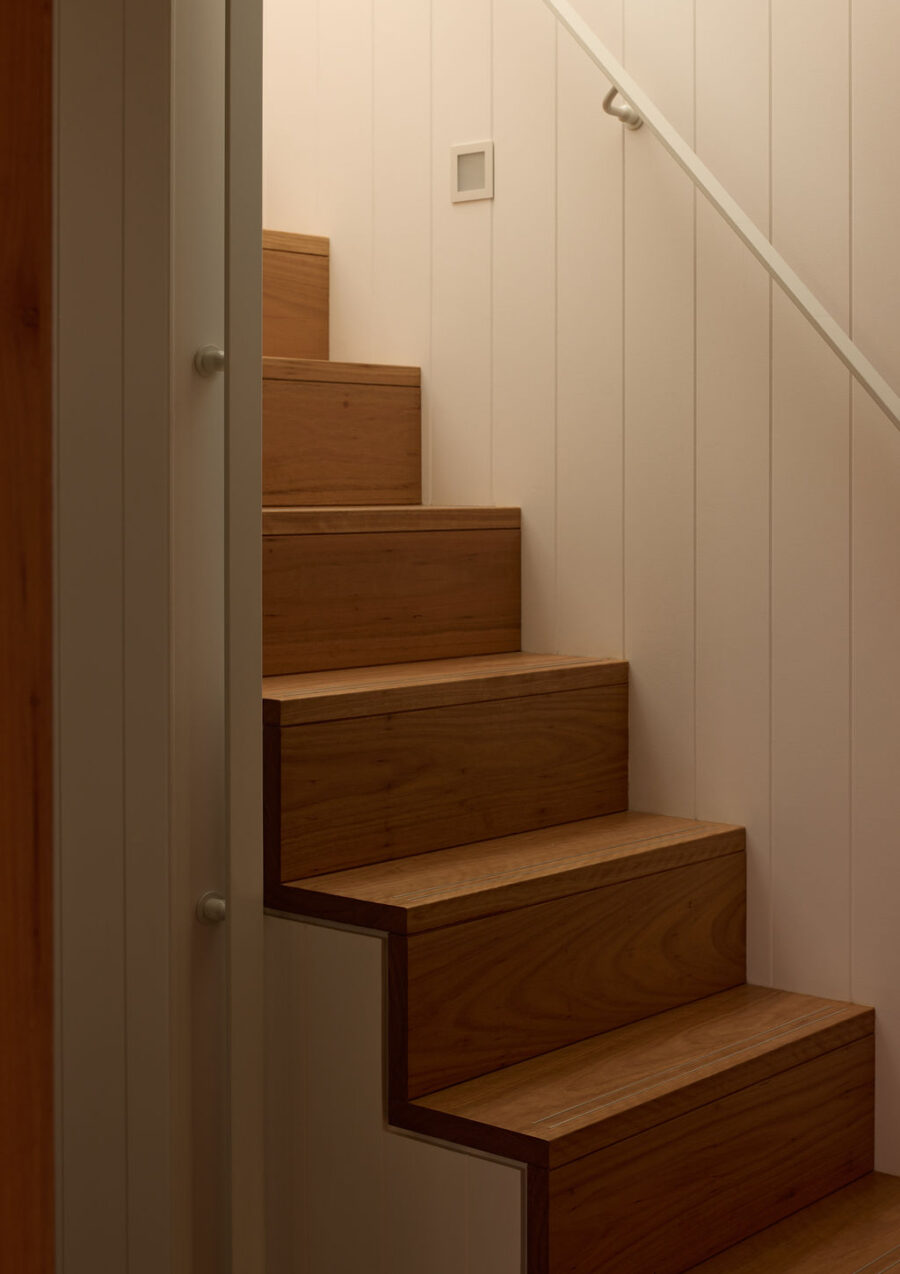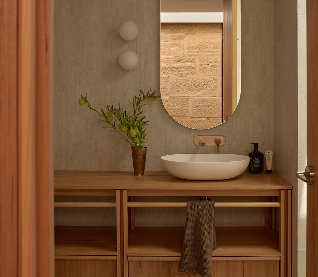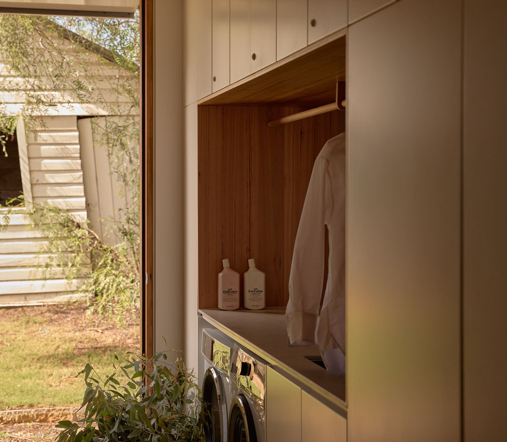 While the form seeks to create separation, the material palette aims to create connection. The corrugated iron sheets, while reminiscent of agricultural materiality, establish a shared language between the dwellings, while the new timber cladding pays tribute to the textural context. Internally, the new timber cladding is expressed as a datum in recognition of the original sandstone walls both in height and in tone, while creating a sense of intimacy within the expansive interior.