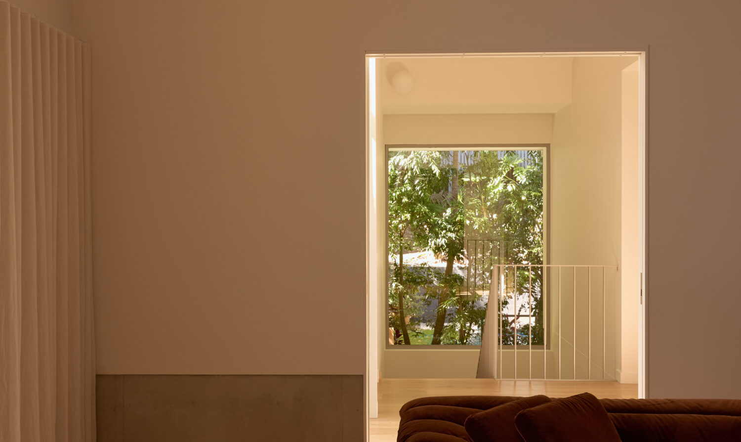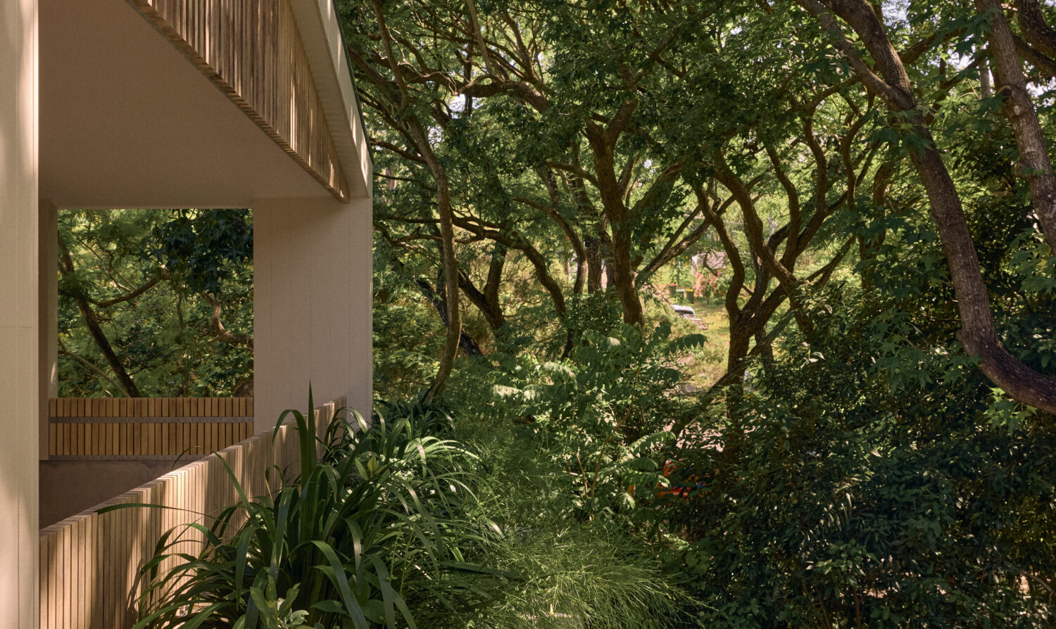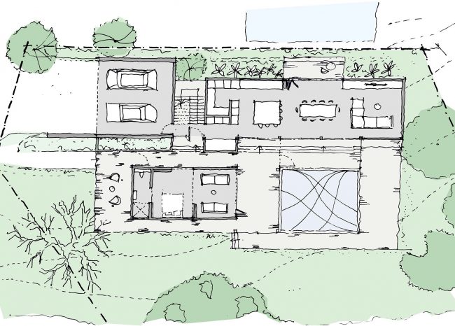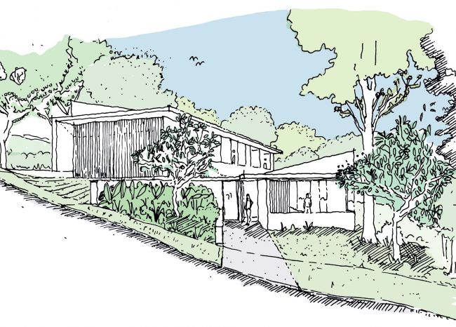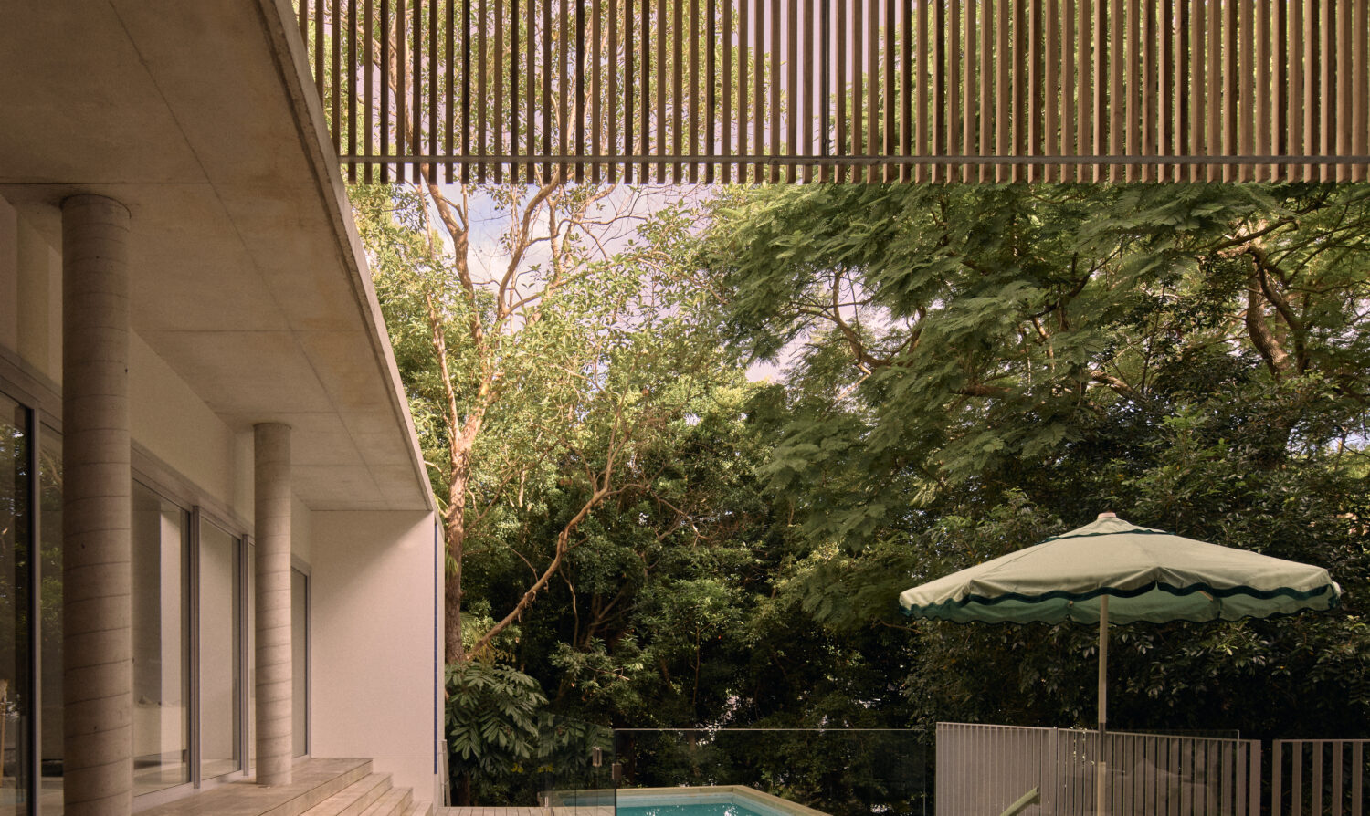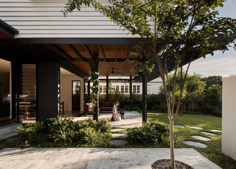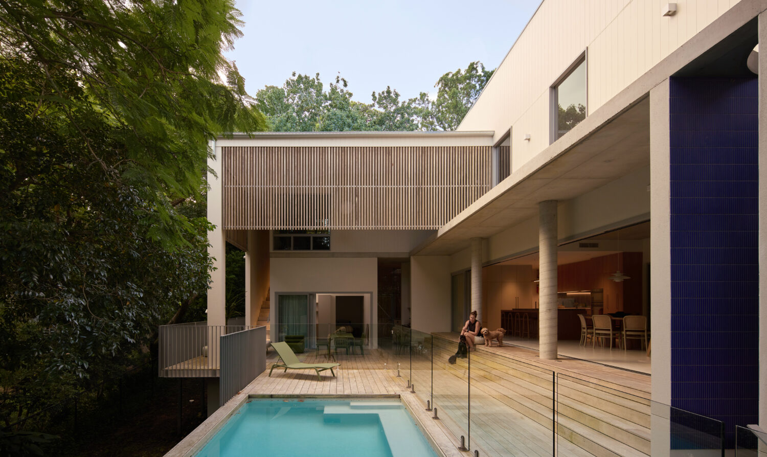 Referencing traditional Queenslander typologies & considering elevated homes with wrapping verandas and deep eaves, we considered the veranda an important characteristic of living in Brisbane. Here, this was inverted so that the L shaped plan enveloped it.