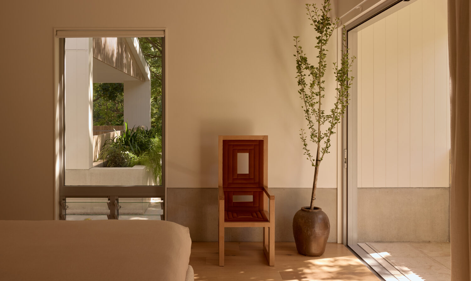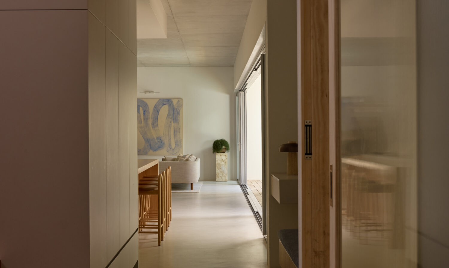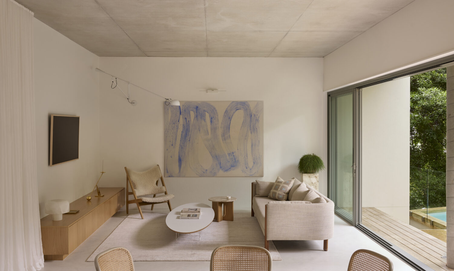 The interiors needed to help the client declutter, live minimally and provide optimal connection to the outdoors. Materially, an exposed slab on ground, ceiling and externally strengthens this interior/exterior relationship while thermally moderating temperature changes and providing coolth. All materials curated to create a calm restful, uncluttered environment.