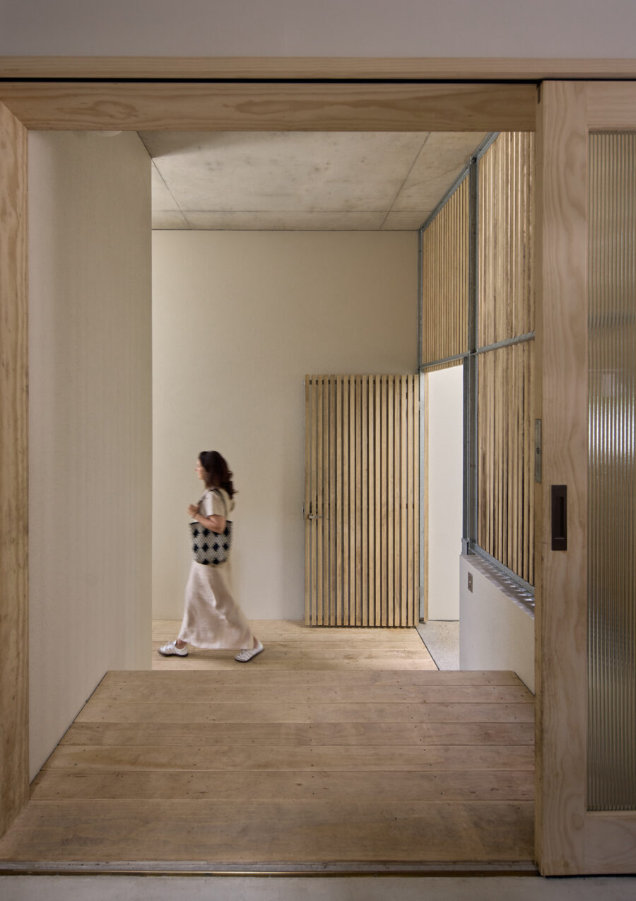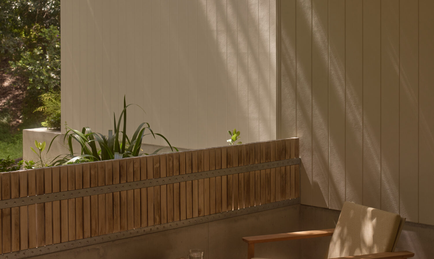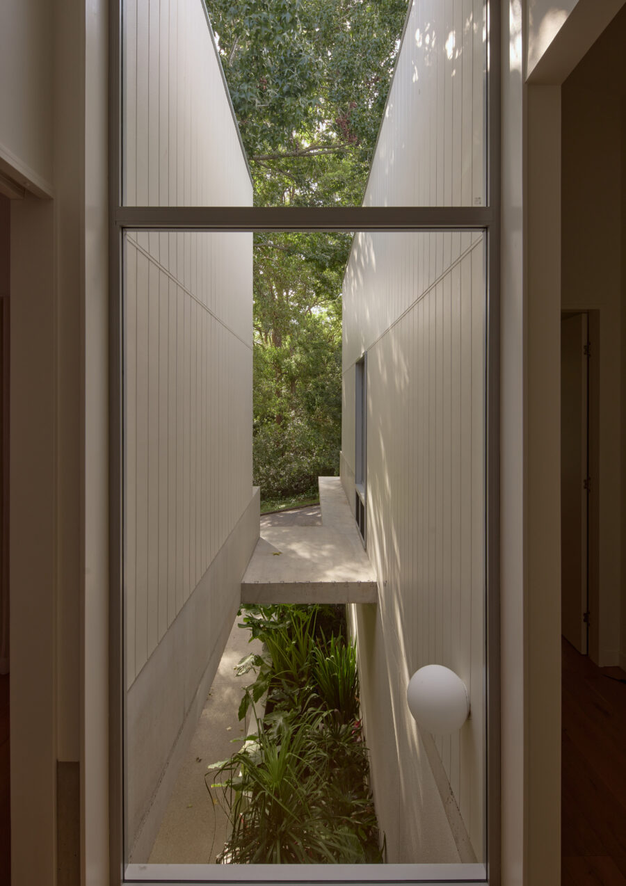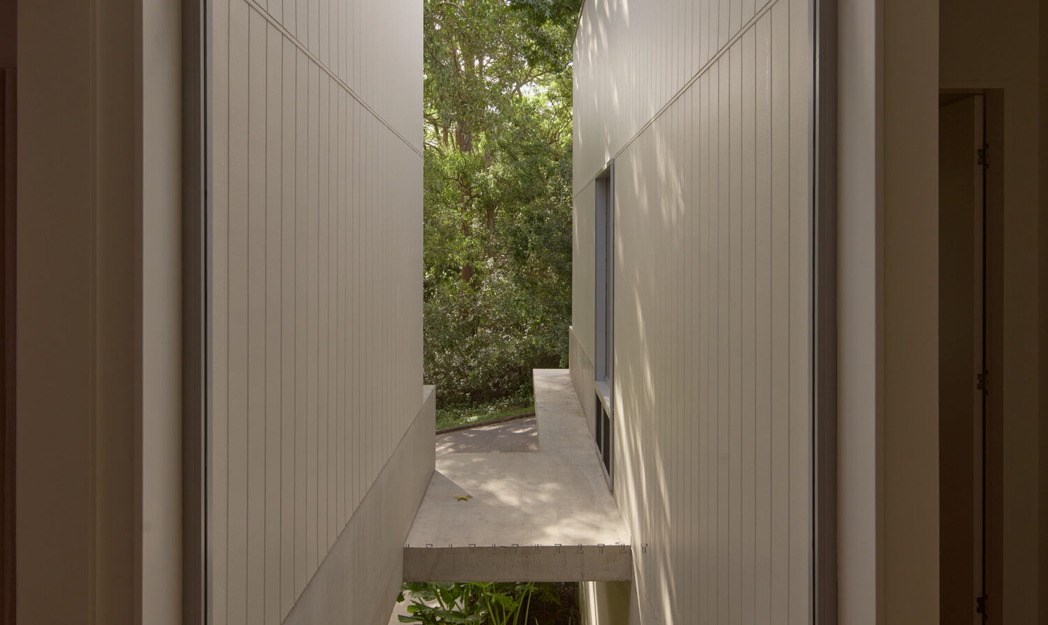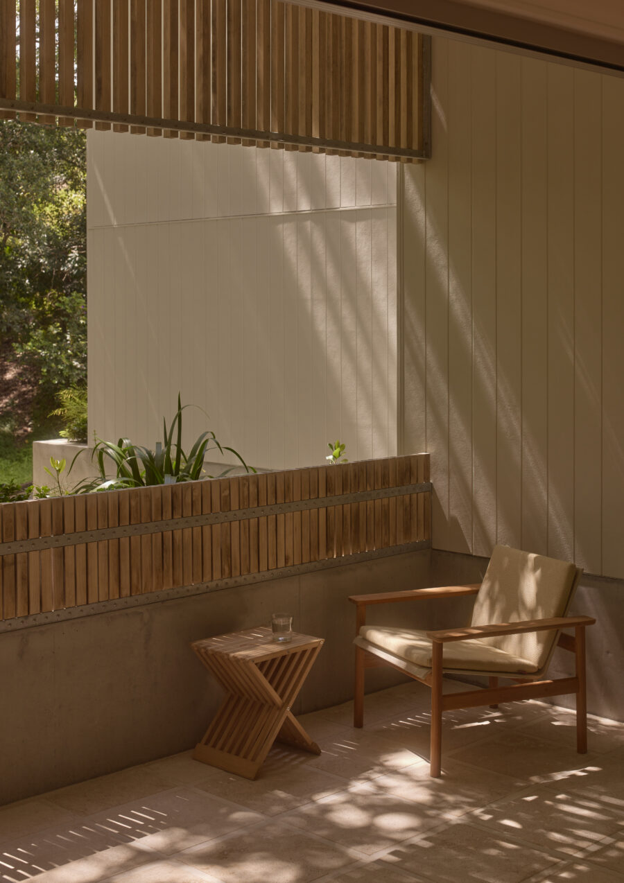 The separation of twin gables forms the entry where a full height gate welcomes arrival into a protected outdoor space – “The contemporary veranda” or engawa. Here, is the first introduction to the external materials continuing within the interior. Experimentation and testing supported the resolution to deliver a home for NYC clients that is of its place while borrowing from their international references.