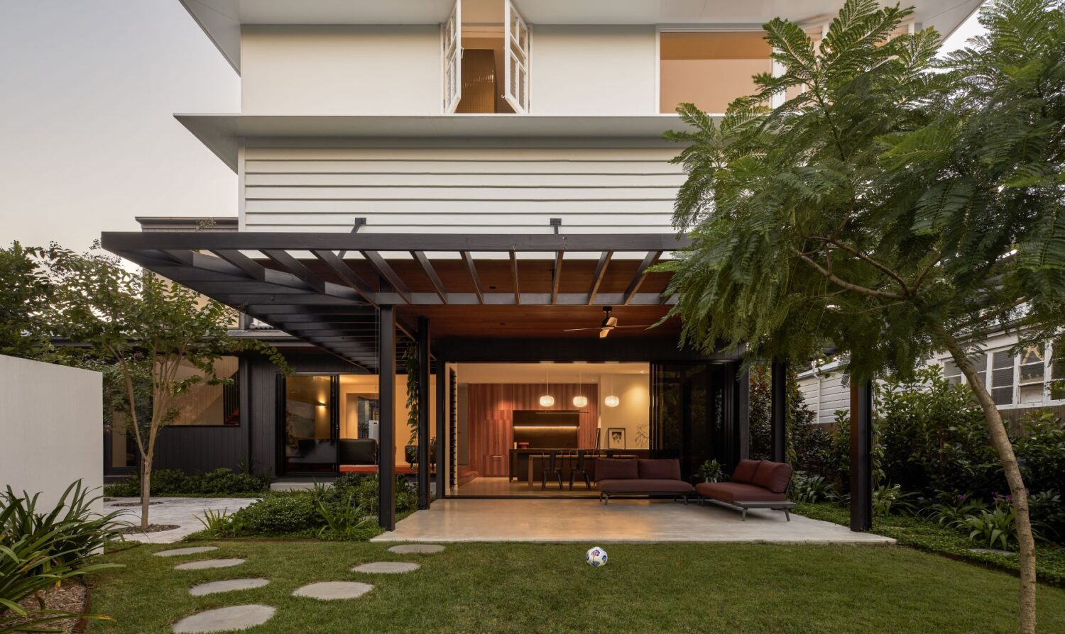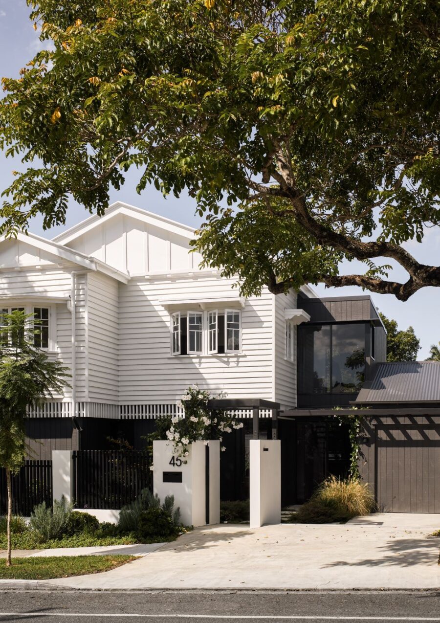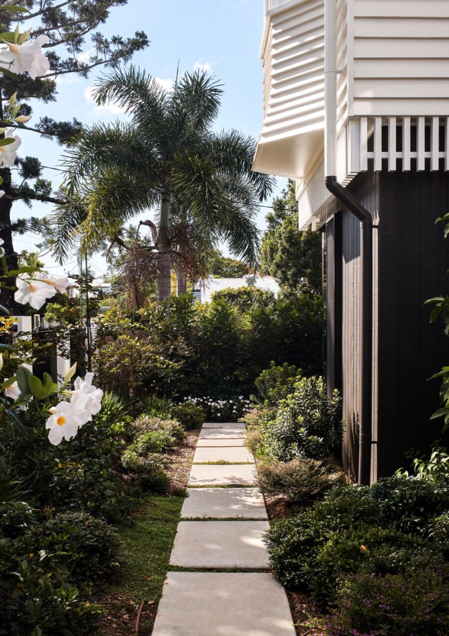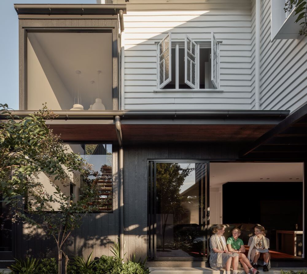 The contemporary extension is dark to recede, and detailed simply to be subservient to the existing cottage. Internally, the interior design pays homage to the dwelling’s heritage, incorporating traditional Queensland heritage colours in contemporary playful, textural materials to evoke a sense of warmth and character.