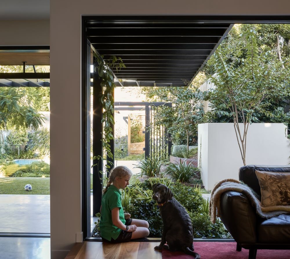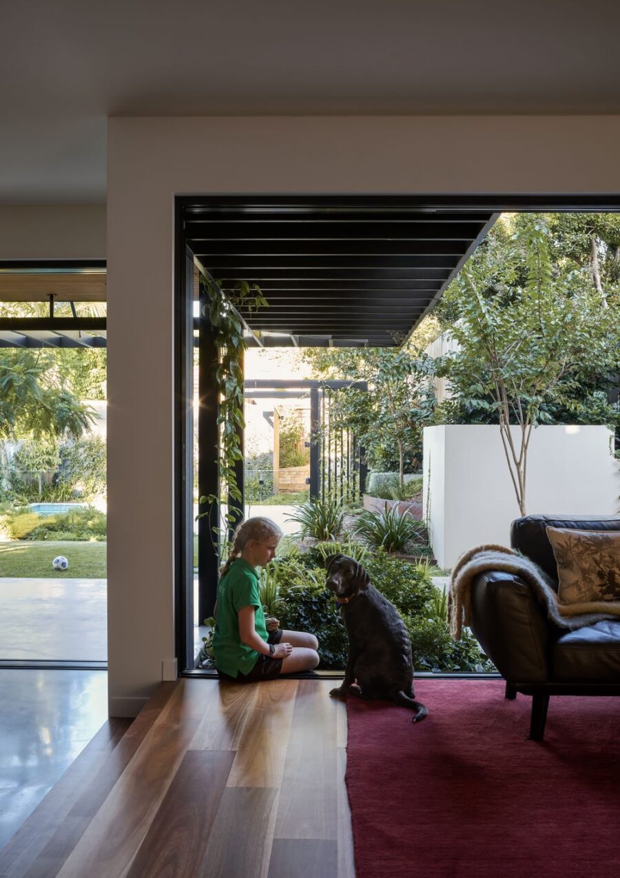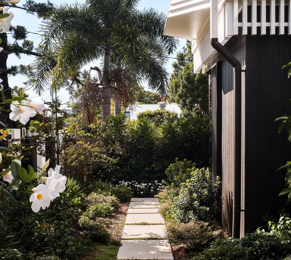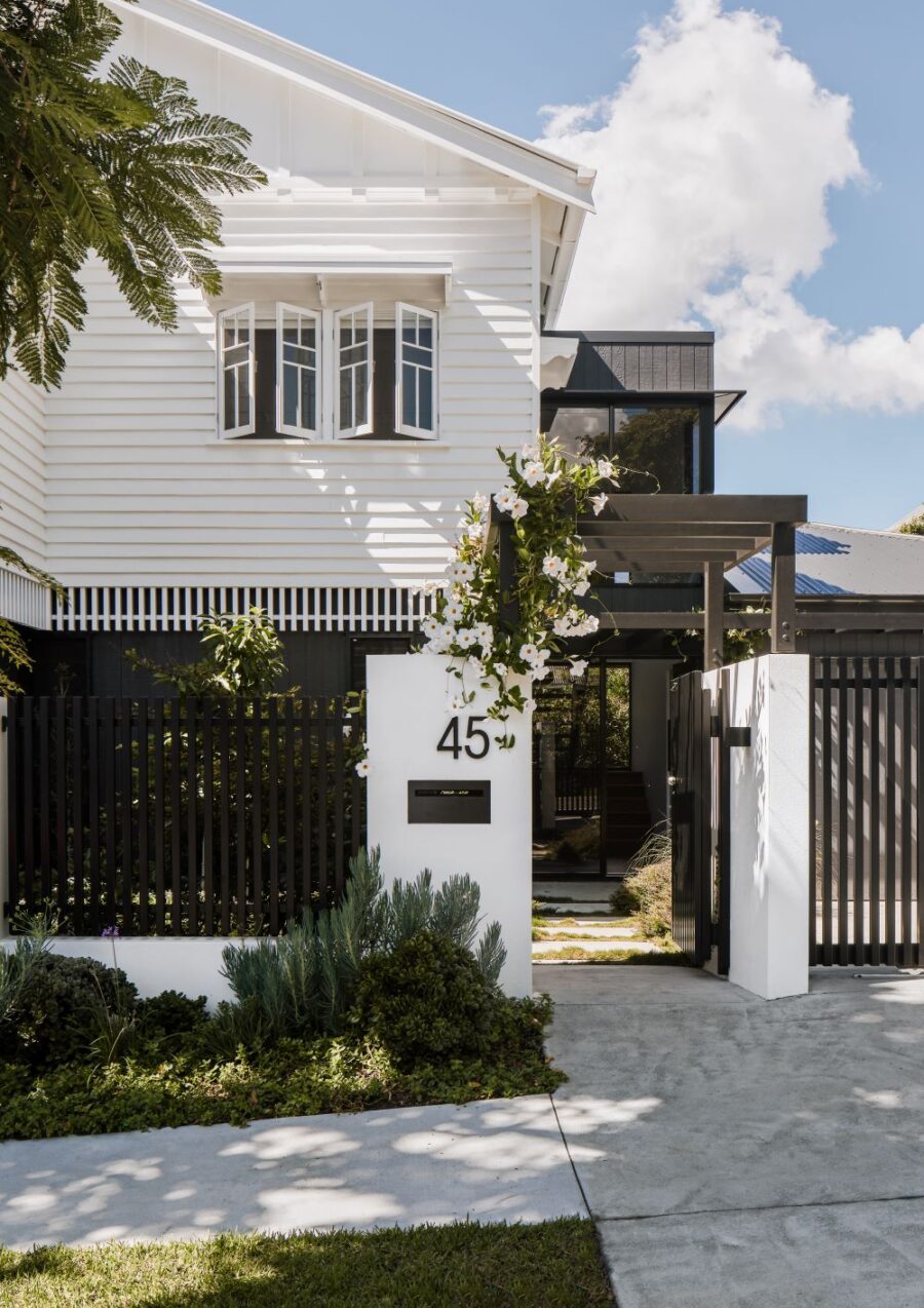 The contemporary extension is dark to recede, and detailed simply to be subservient to the existing cottage. Internally, the interior design pays homage to the dwelling’s heritage, incorporating traditional Queensland heritage colours in contemporary playful, textural materials to evoke a sense of warmth and character.