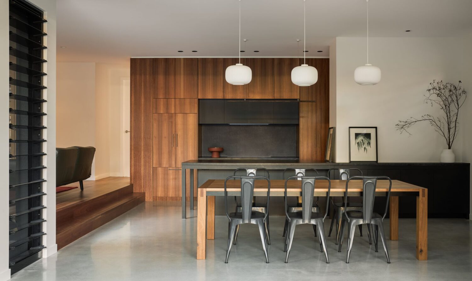 The new ground level includes all primary living spaces with a guest suite while the Queenslander at upper level is restored for bedroom spaces and secondary lounge. The cottage, retains traditional detailing and shared sunroom.