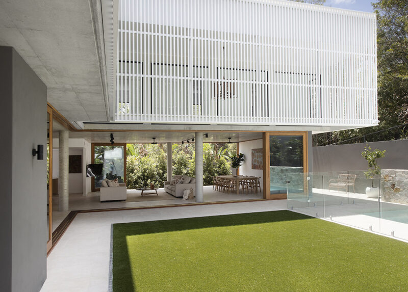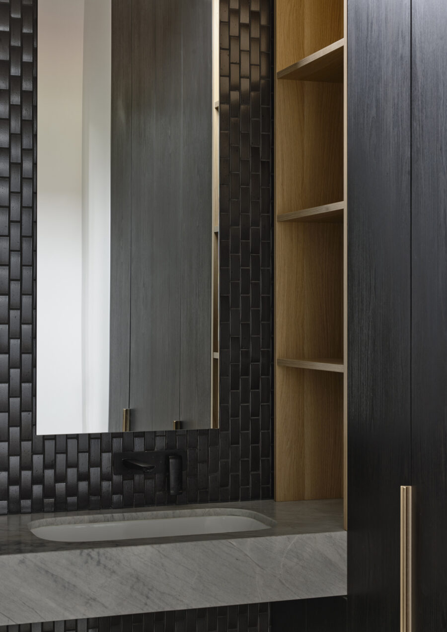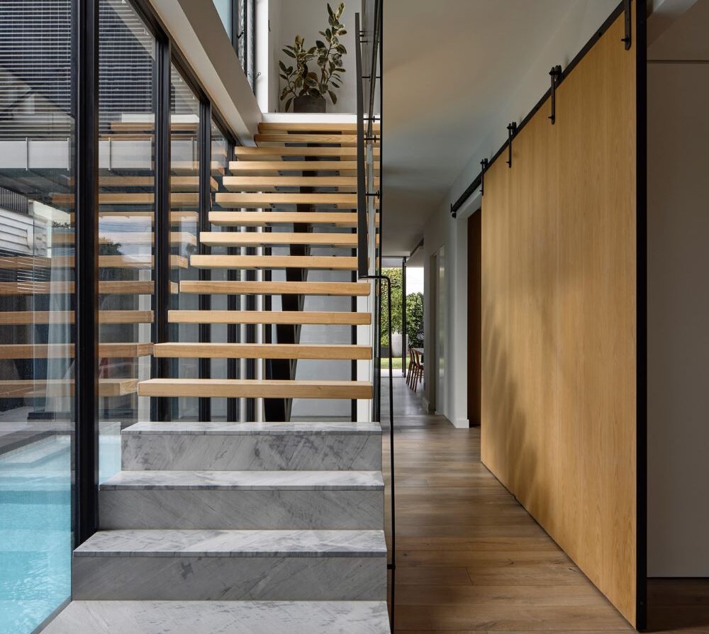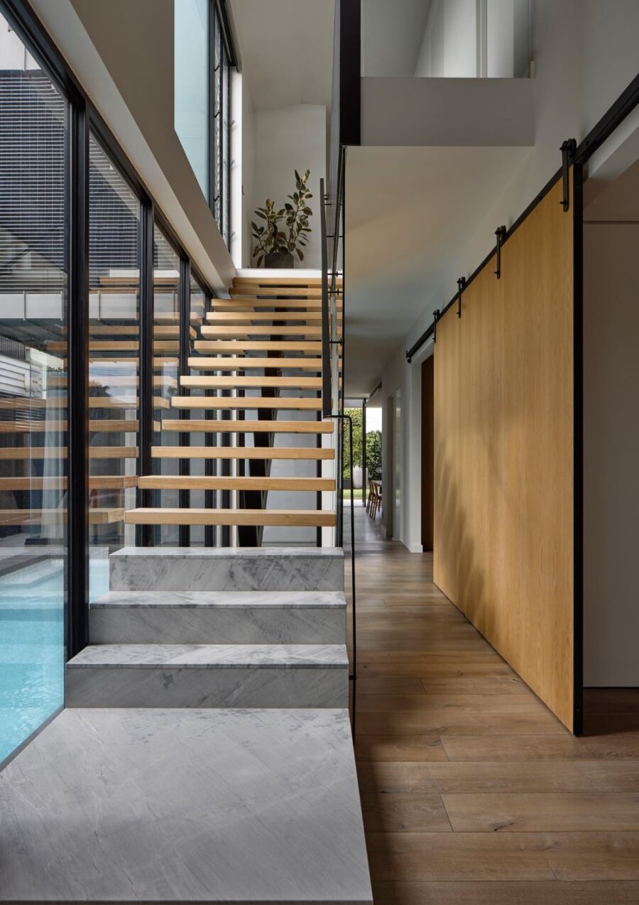 Natural light is a feature throughout, with a central north facing pool court, a focus around which the house wraps. At the heart of the living space an extruded “lantern” provides height to the south where high-level mirrors are employed to bounce light around the space year-round & extend the feeling of space.