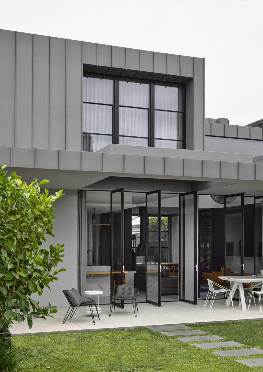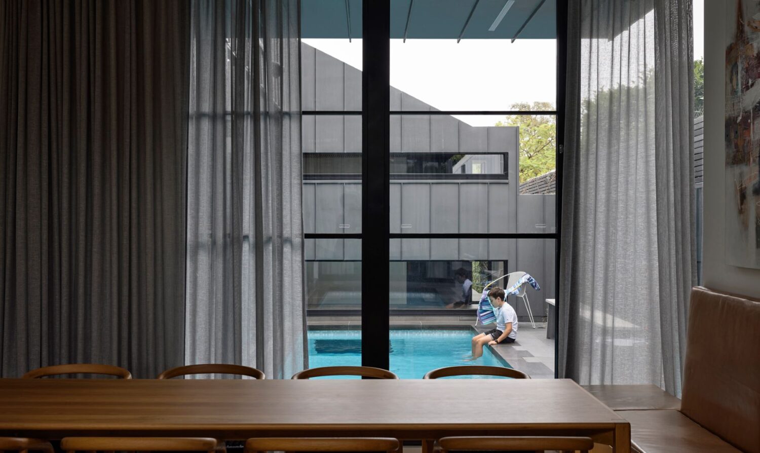 Taking its cues from the cascade of gables of the existing bungalow, the new extension envelopes the urban edge of the site in folding zinc roof & wall, providing a robust but dynamic material edge to the laneway and adjacent town houses. Hugging the boundary along the laneway affords greater width within the site to create a private enclave internally for a pool courtyard & gardens, enabling the house to turn its back on neighbouring apartments and create a dramatic light filled focal point around the north facing pool.