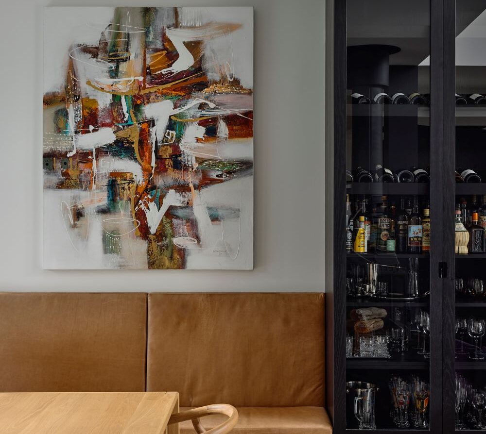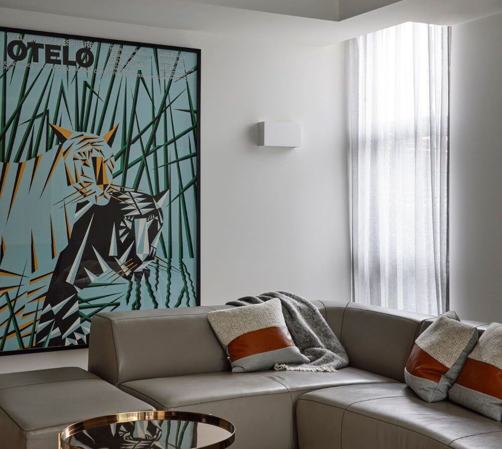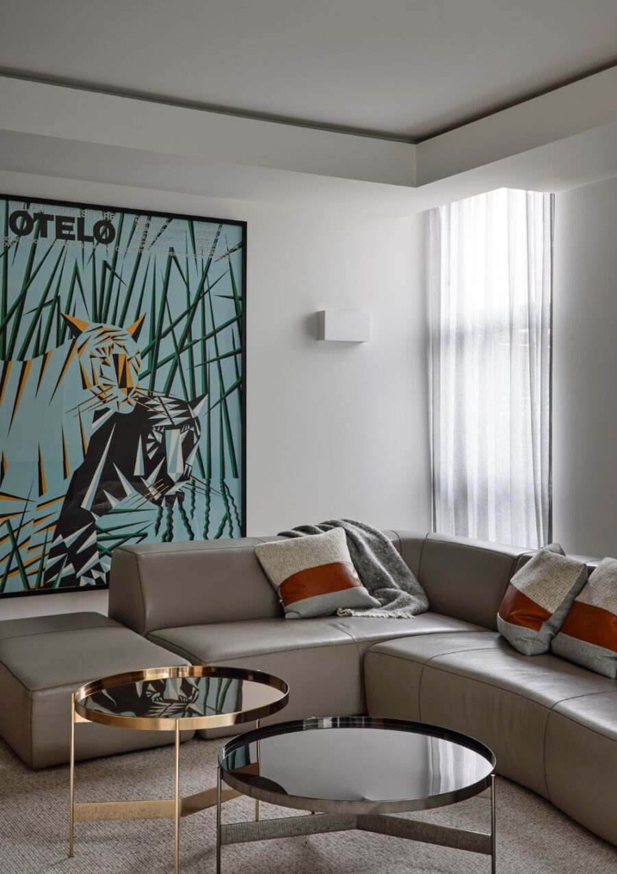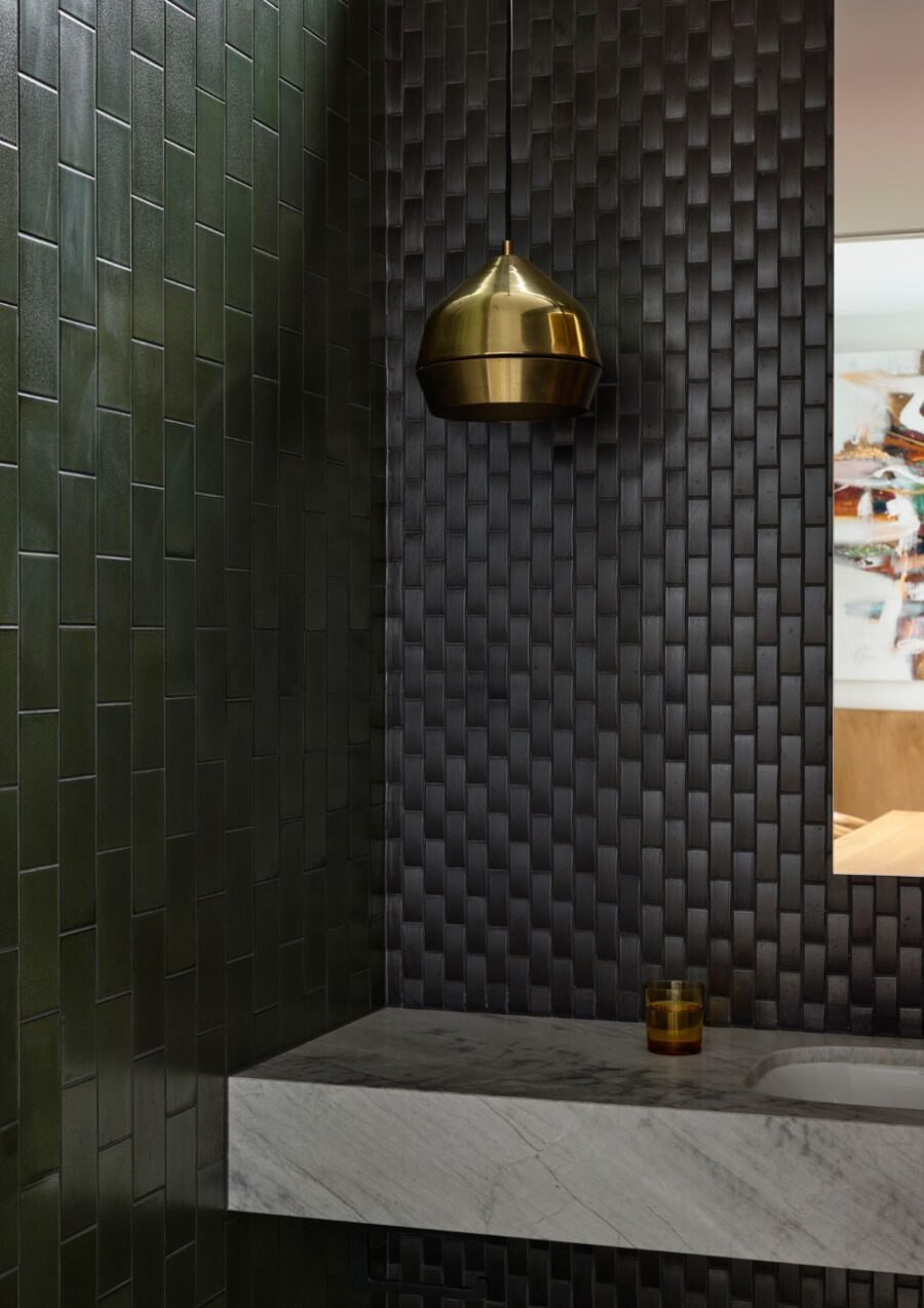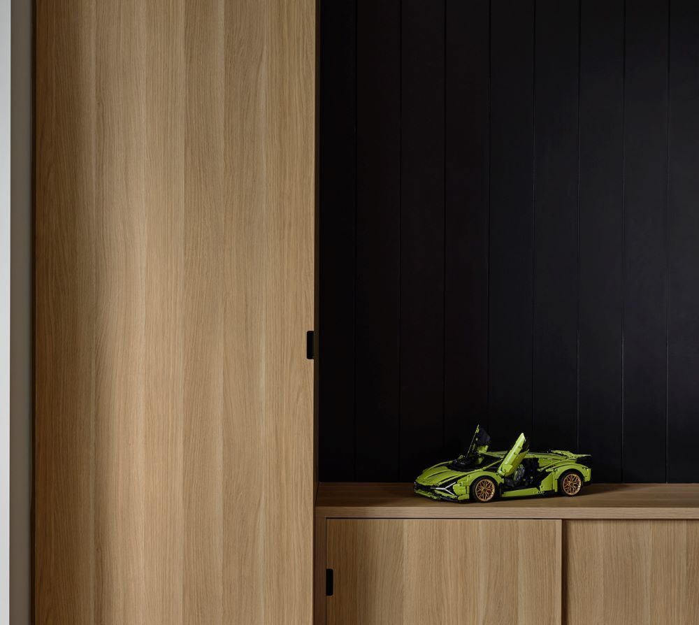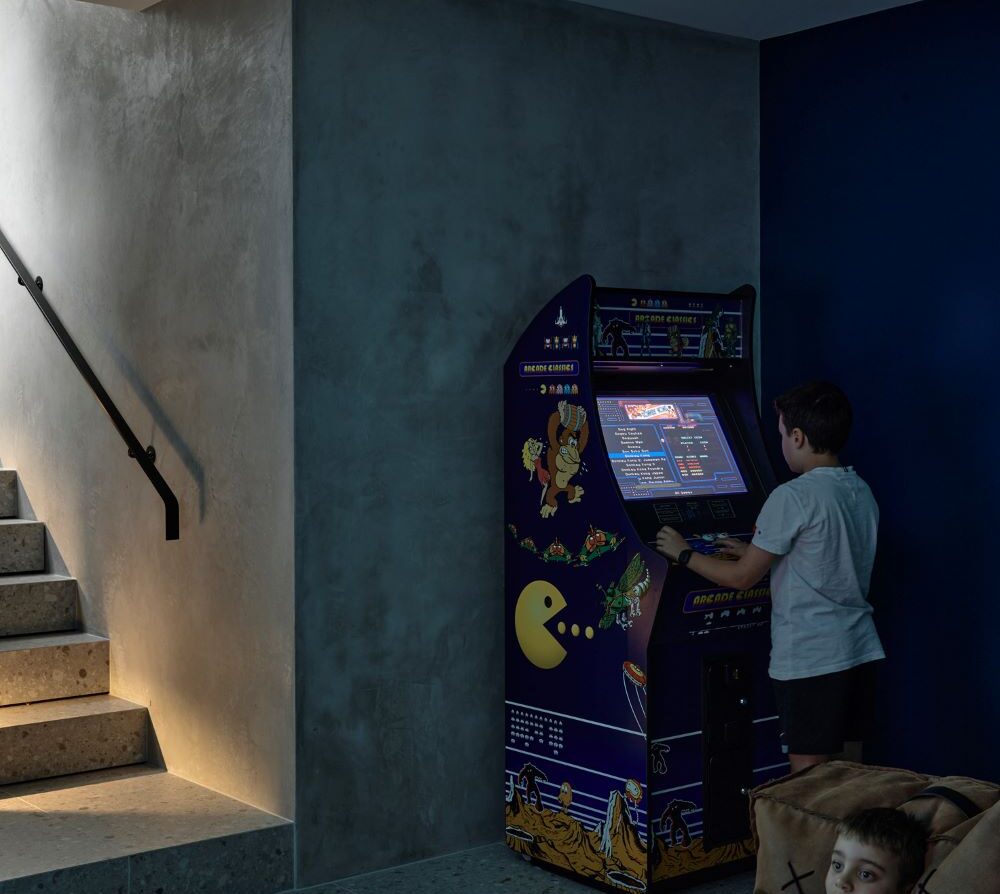 A basement space creates a contrast to the upper floors, making way for a play space, rumpus and wine cellar. A custom super mural provides the backdrop to movies & games, all lit in the moody blue light from the pool window.