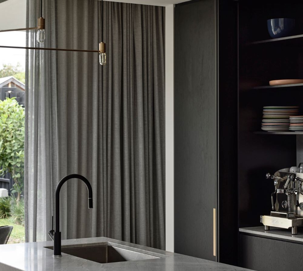 Internally the transition from existing cottage to extension is legible through subtle level changes and traditional features that have been retained & layered with new insertions of cabinetry. Our incredible clients enjoy colour & textural richness, evident in the simple but bold kitchen space, warmth of the timber contrasted to soft milky tones of the stone. Elegant custom steel pivot doors seamlessly connect the living space to the garden.