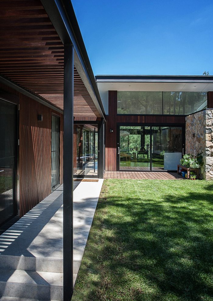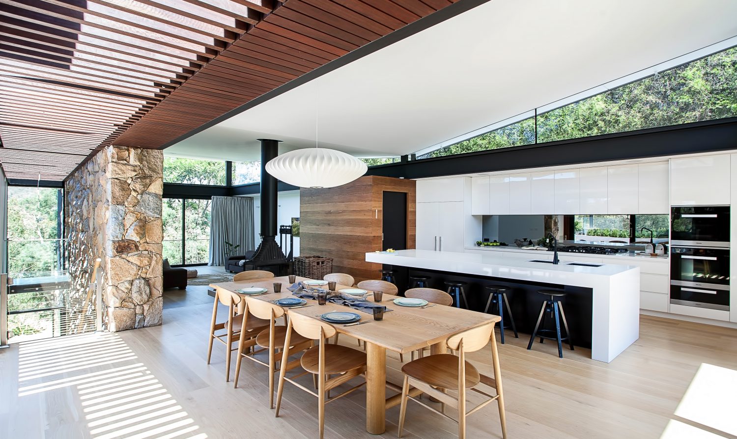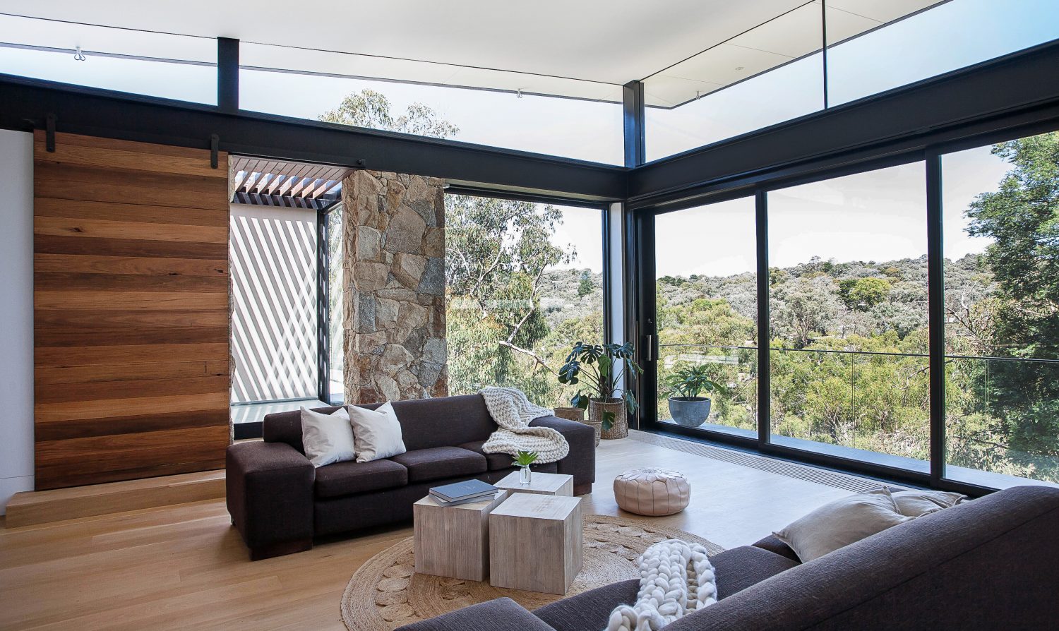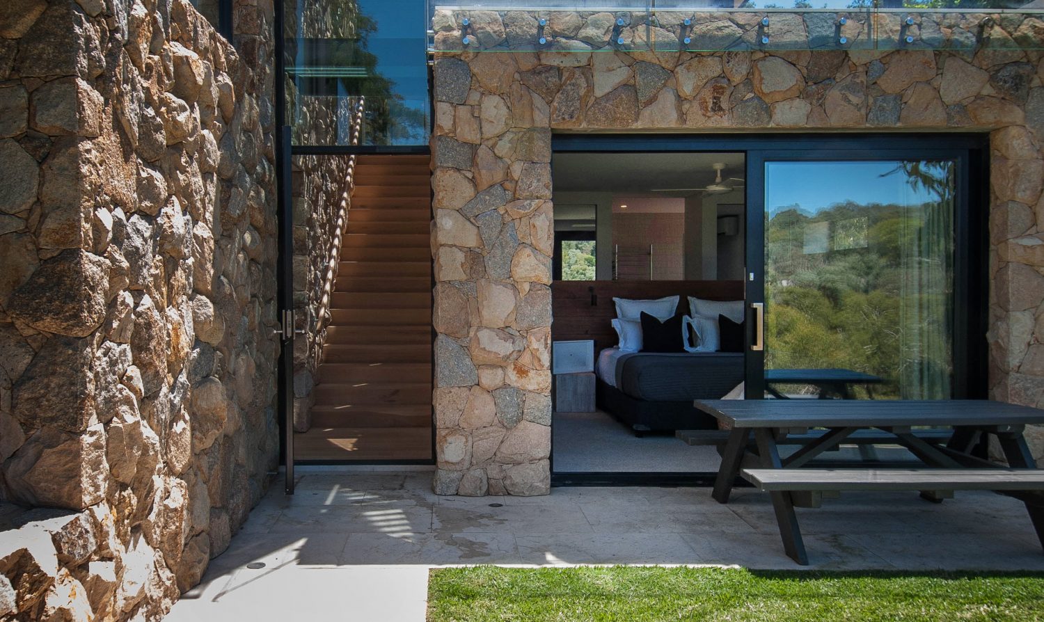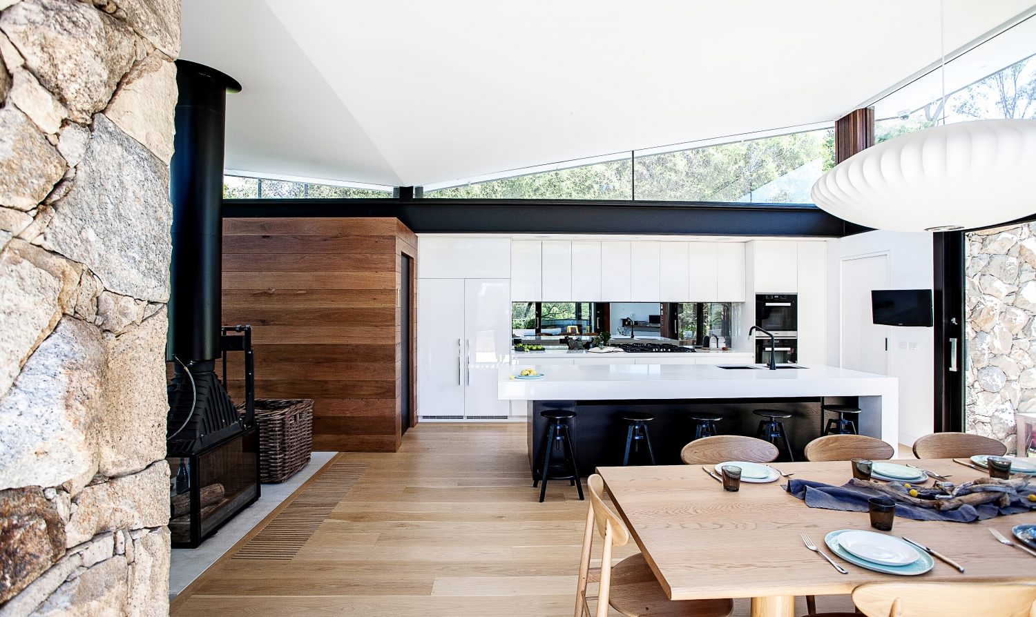 Combining stone and timber with contemporary construction materials including glass and steel the dwelling takes its cues from the material character of the rocky and forested surrounds. Naturally finished stone walls bring tactility and warmth to the interior and allow the exterior of the building to gently recede into the bushland setting.