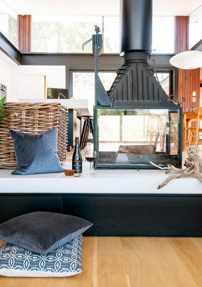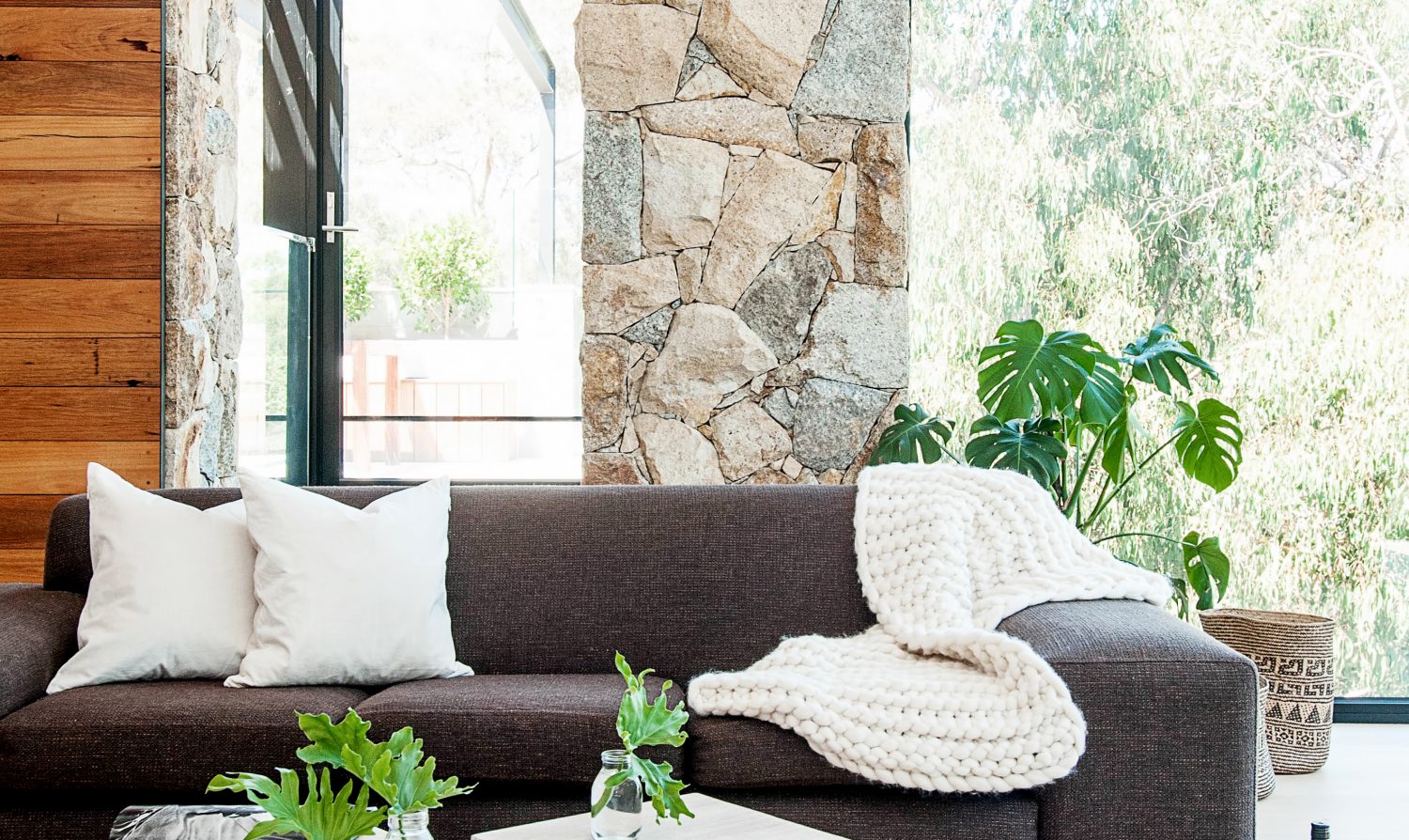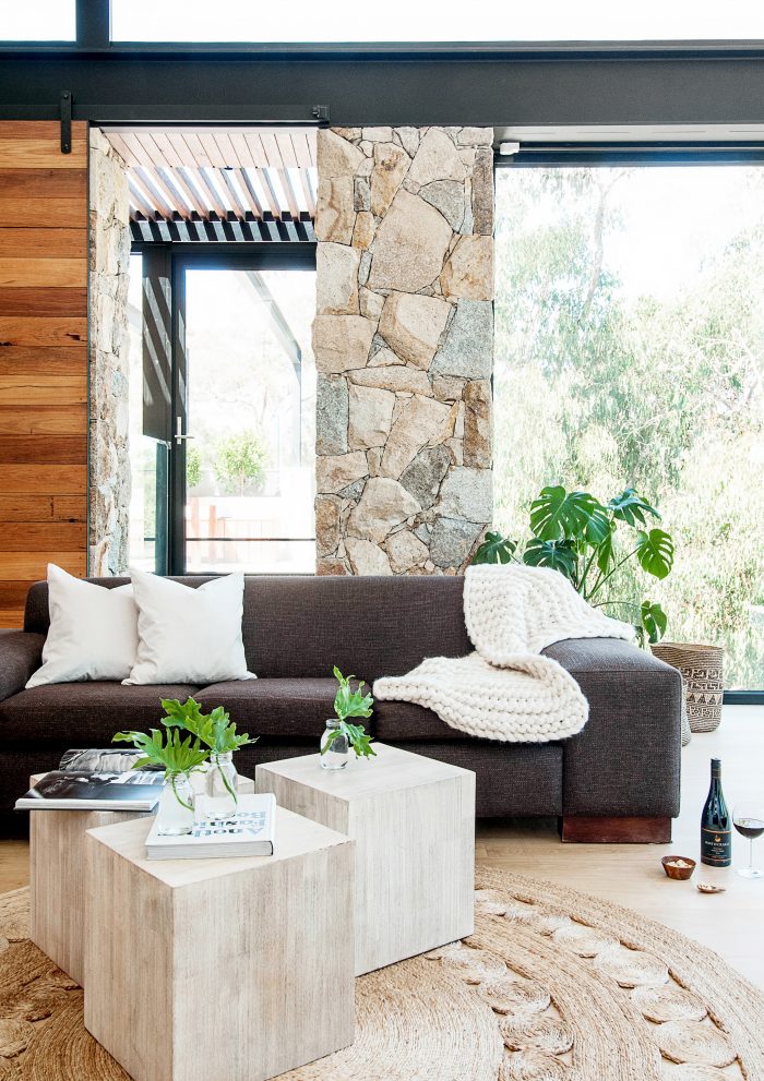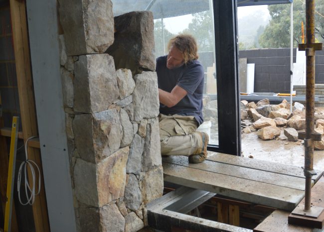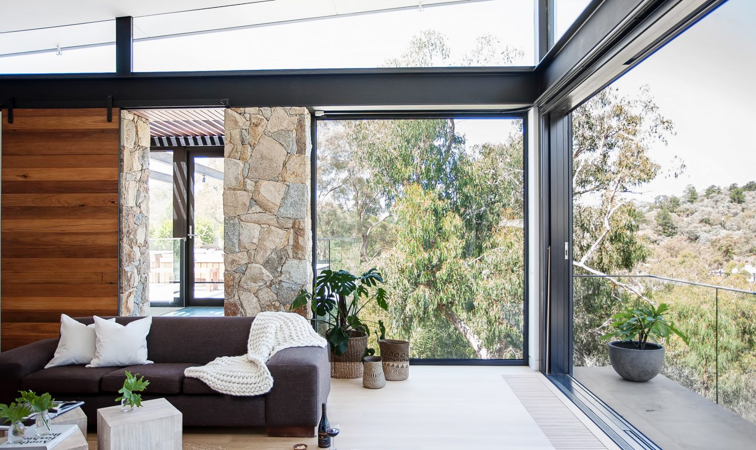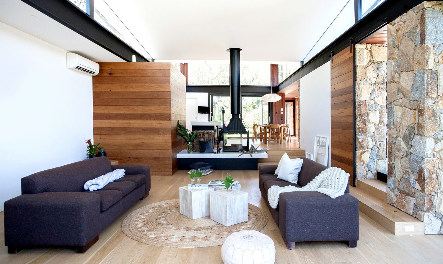 Combining stone and timber with contemporary construction materials including glass and steel the dwelling takes its cues from the material character of the rocky and forested surrounds. Naturally finished stone walls bring tactility and warmth to the interior and allow the exterior of the building to gently recede into the bushland setting.