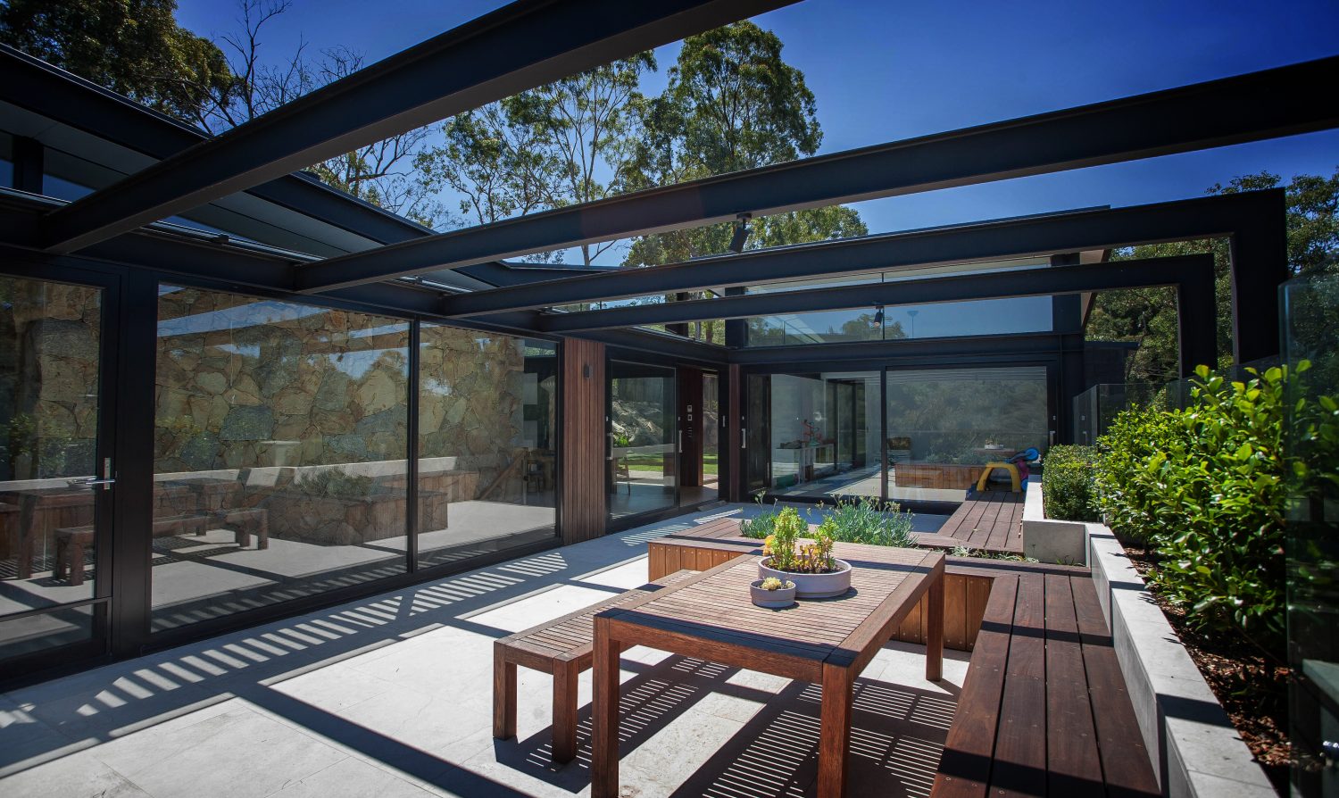 This bold contemporary home perches high above the Yarra River at North Warrandyte on a raised plateau nestled amongst dense native bushland.