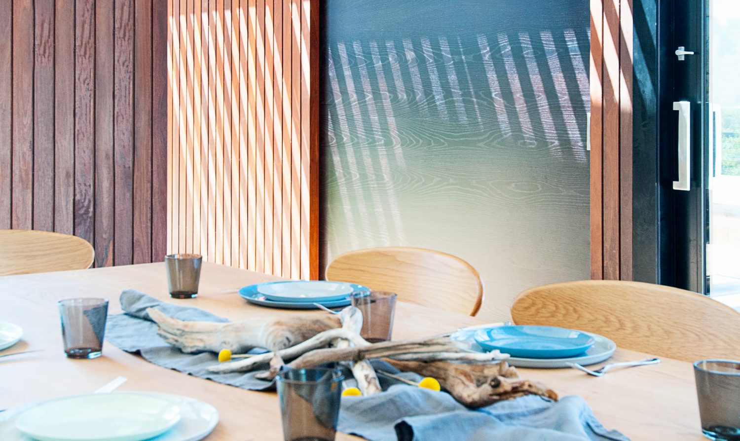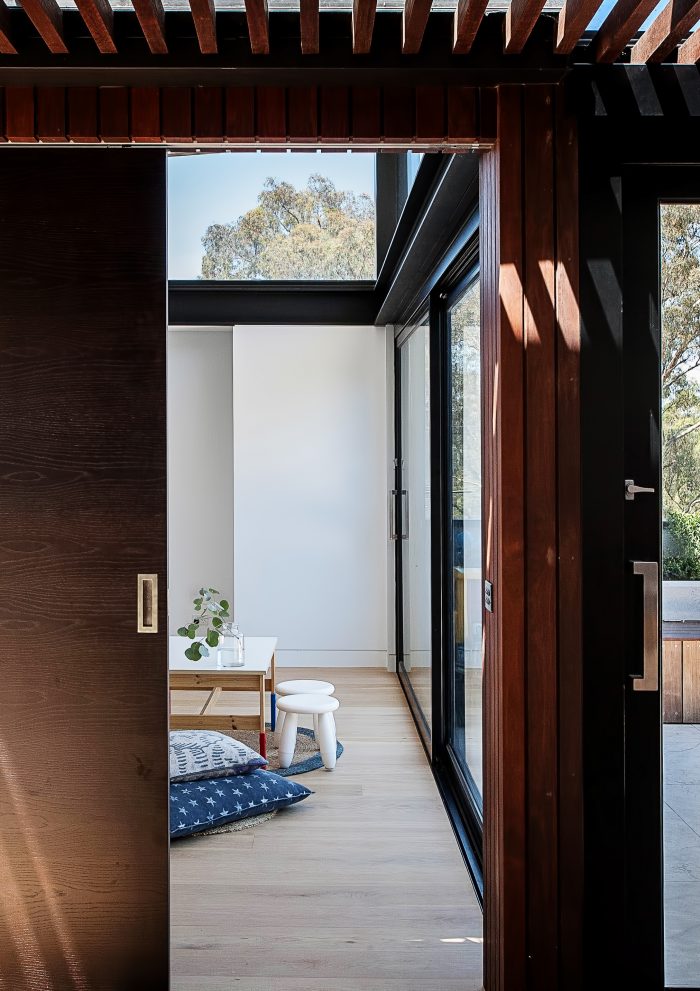Twin butterfly roofs were developed to enable sailing eaves to frame views of the tree canopy and sky and allow sunlight to illuminate interior spaces via high level glazing. A split form allows two ‘wings’ of the dwelling to be sited independently so that views, privacy and outdoor access can be enjoyed unimpeded.